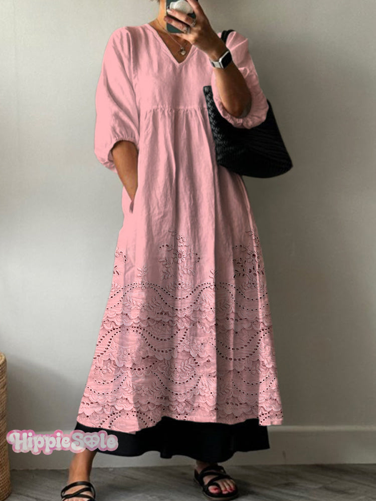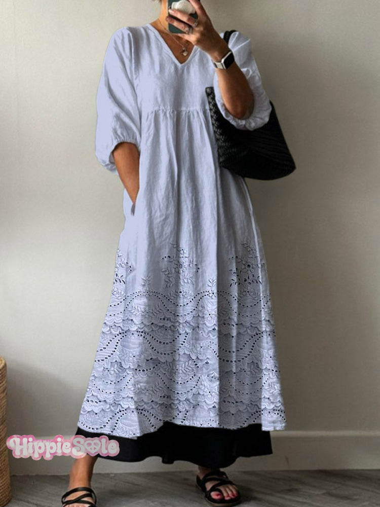 Women's Vintage Lovely Floral Lace Pattern Art Print Pocket V-neck Cotton Dress