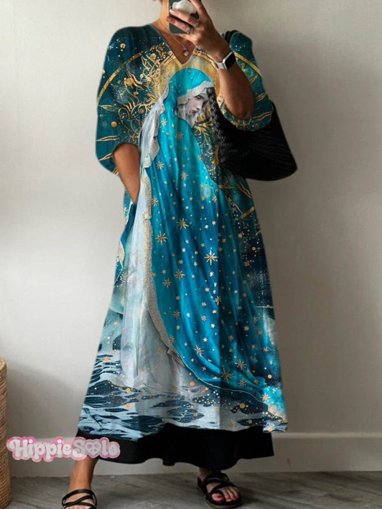 Women's Vintage Mary Star Of The Sea Art Print Pocket V-neck Cotton Dress