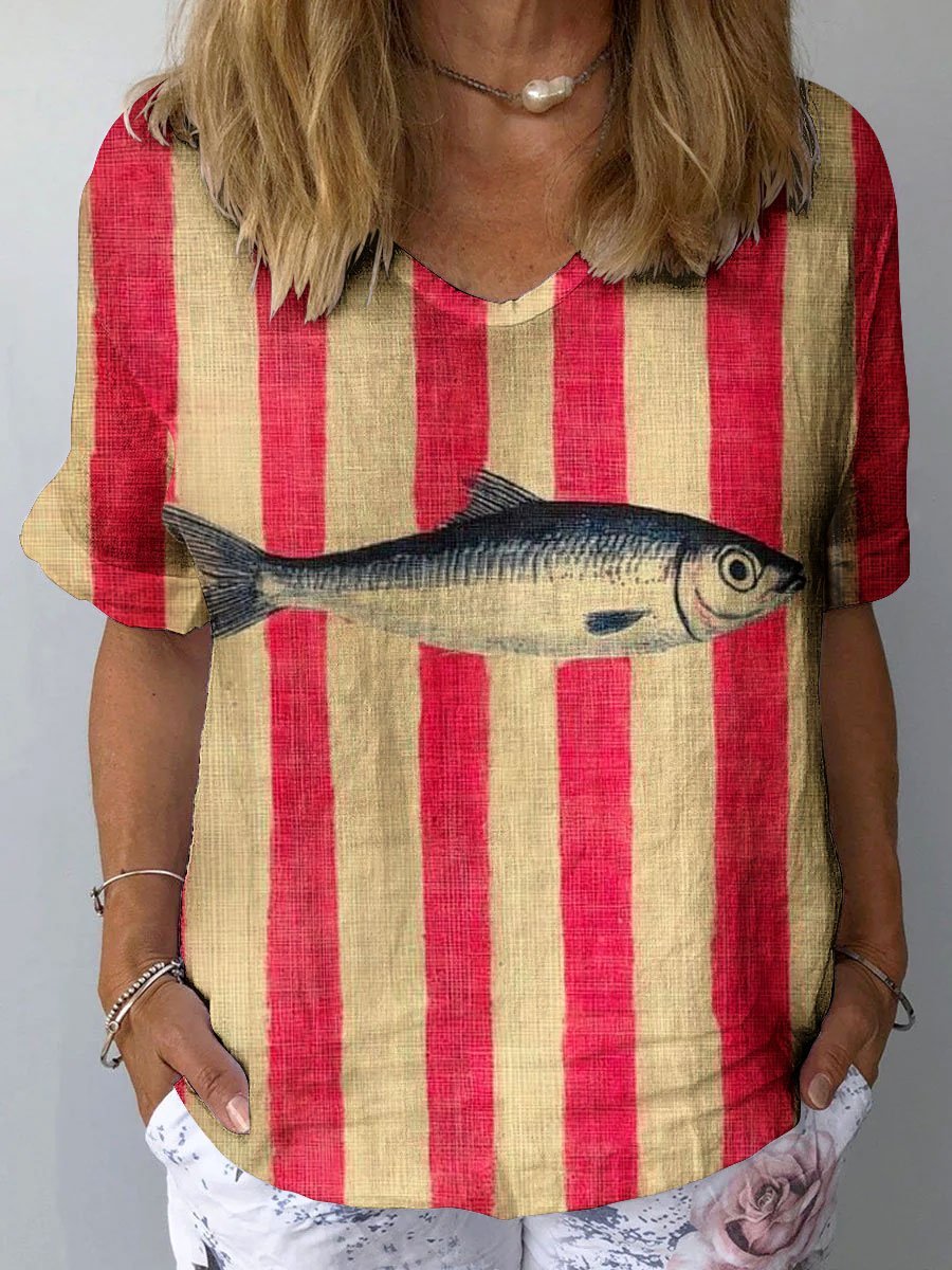 Women's Vintage Ocean Fish Art Print Casual Cotton And Linen Shirt