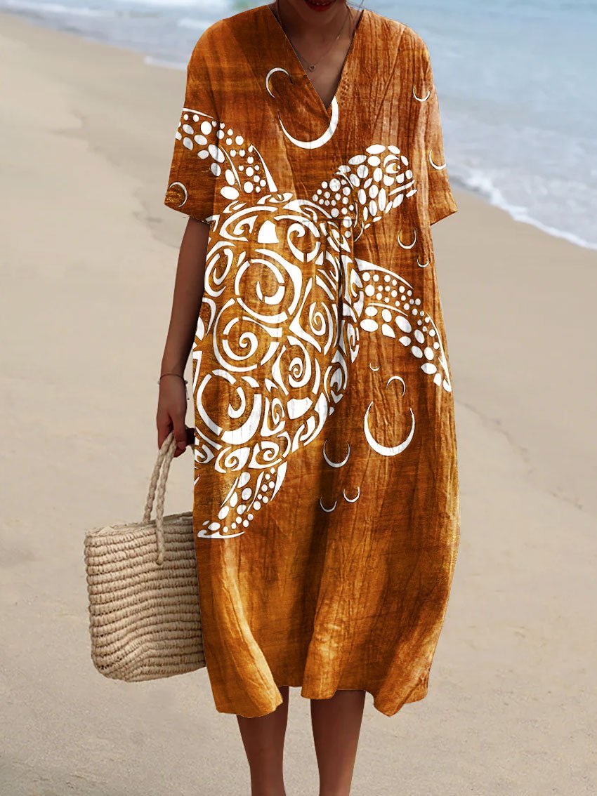 Women's Vintage Ocean Turtle Art Print Flowy Dress