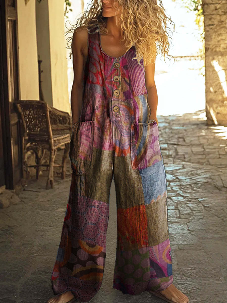 Women's Vintage Patchwork Art Print Casual 100% Cotton Wide Leg Jumpsuit