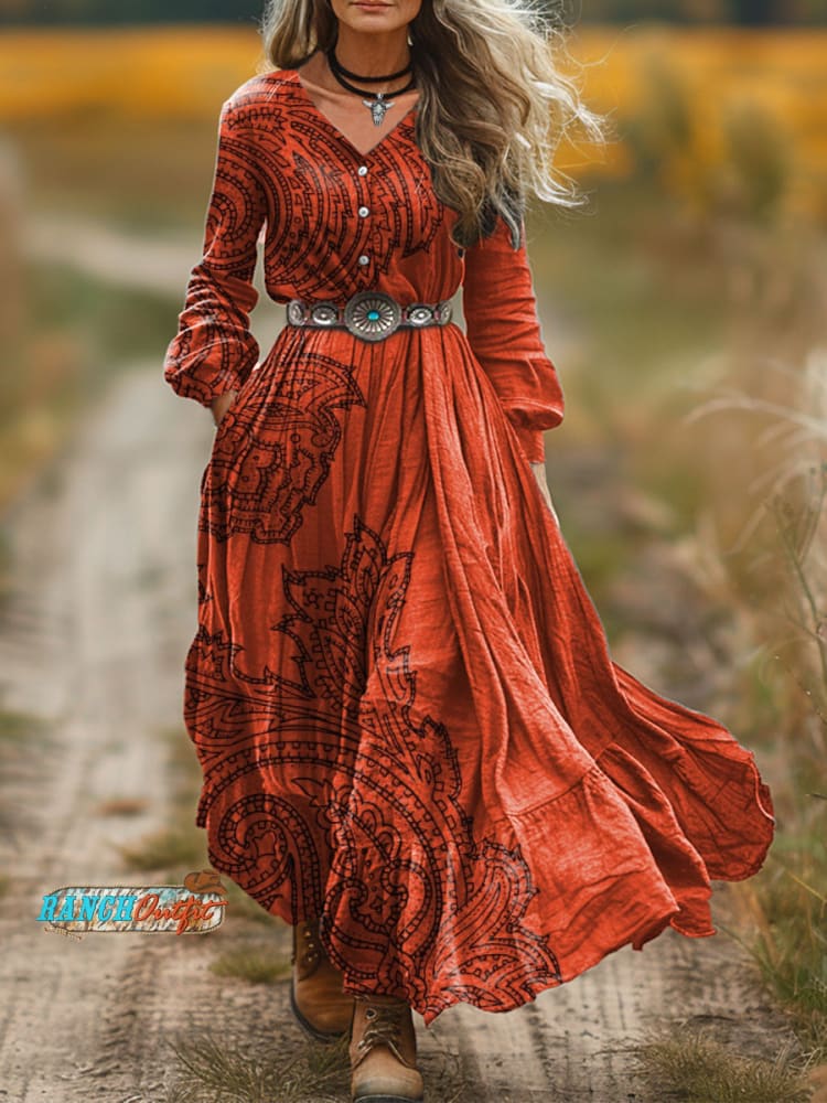 Women's Vintage Print V-Neck Button Pocket Cotton Dress