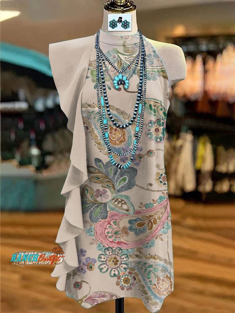 Women's Vintage Print V-Neck Button Pocket Cotton Dress