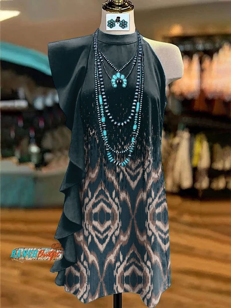 Women's Vintage Print V-Neck Button Pocket Cotton Dress