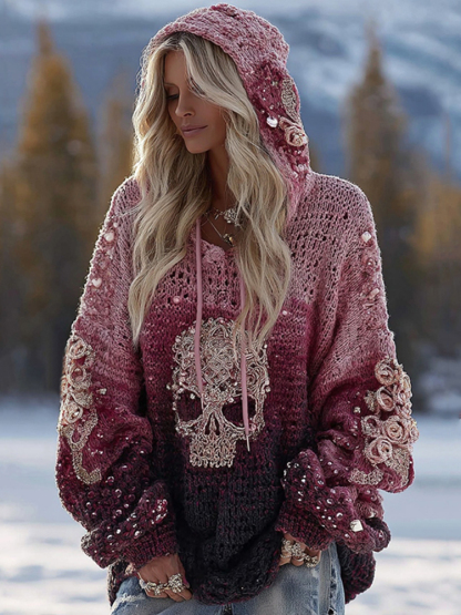 Women's Vintage Skull And Floral Gradient Art Knit Hooded Sweater