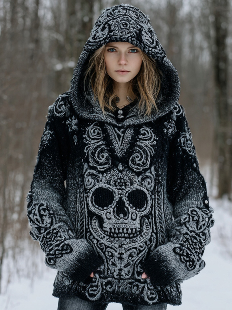 Women's Vintage Skull Gradient Art Knit Hooded Sweater