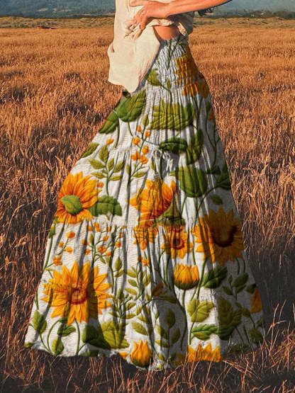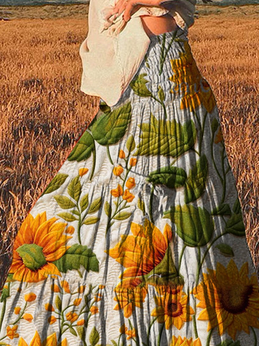 Women's Vintage Sunflower Art Pattern Print Cotton Pocket Skirt