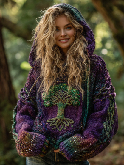 Women's Vintage Tree Of Life Celtic Gradient Art Knit Cozy Hooded Sweater