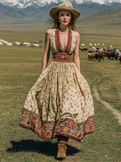 Women's Vintage Western Floral Ethnic Print V-neck Sleeveless Maxi Dress