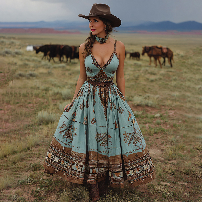 Women's Western Geometry Print Suspender Maxi Dress