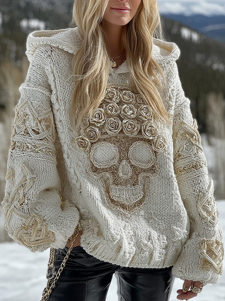 Women's White Rose Skull Comfortable Loose Solid Color Hooded Sweater
