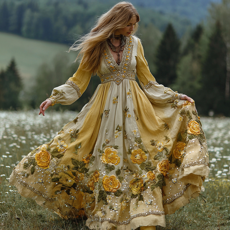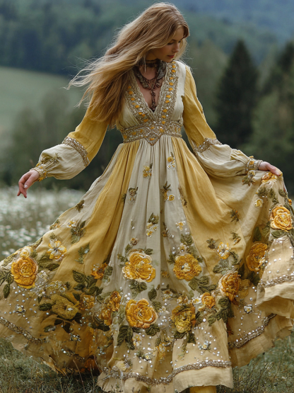 Women's Yellow Floral Art Print V-neck Long Sleeve Maxi Dress