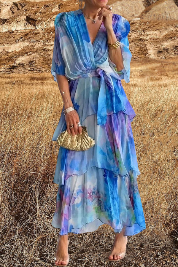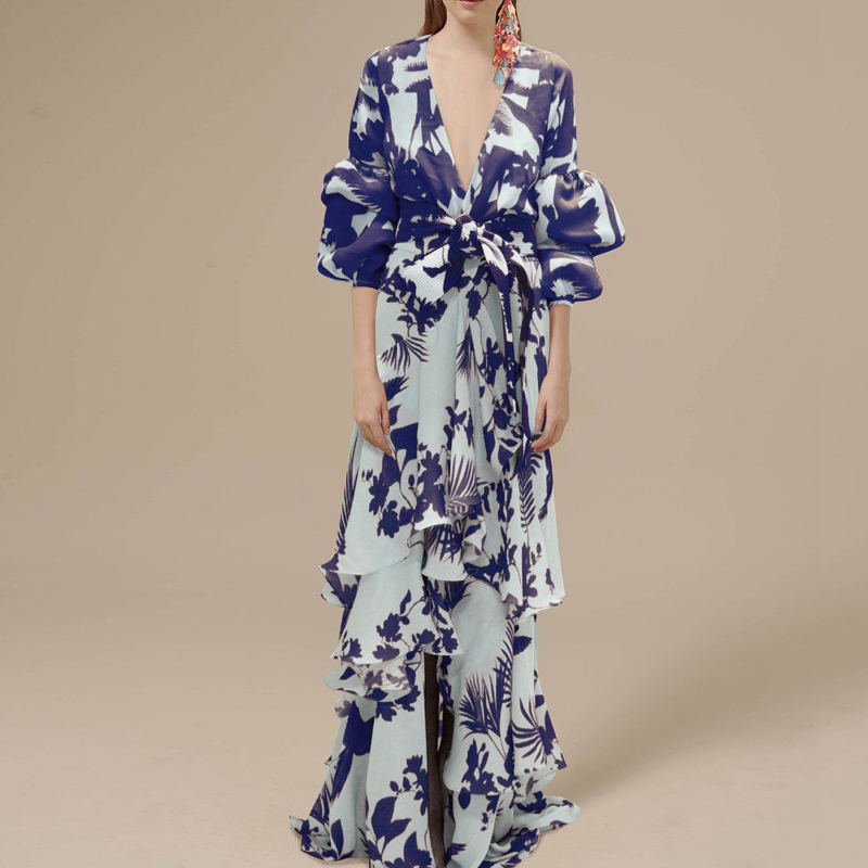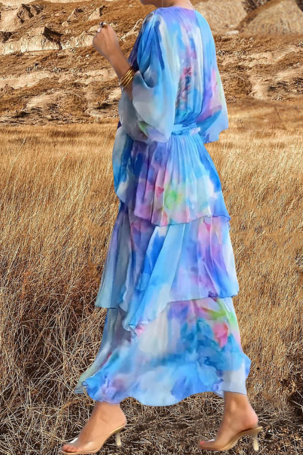 French Sky Blue Asymmetrical Print Chiffon Long Dresses Summer