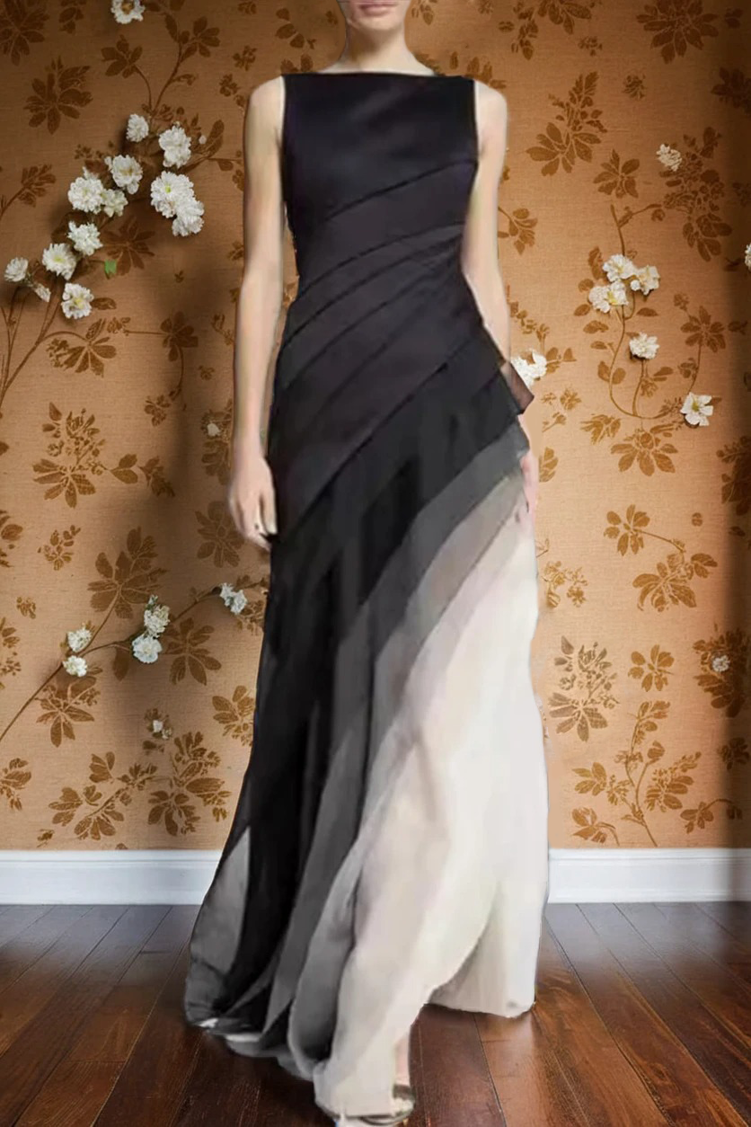 French Black High Waist Patchwork Tulle Maxi Dresses Sleeveless