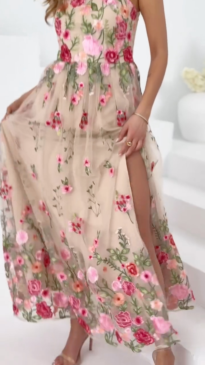 Design: Features a one-shoulder silhouette that elegantly reveals the lines of one shoulder and the neck, creating a look that is both sophisticated and alluring. The full-coverage floral embroidery pattern exudes a fresh, refined charm and naturally evokes a romantic atmosphere. A side slit in the hemline allows for graceful movement, beautifully revealing the legs as you walk.