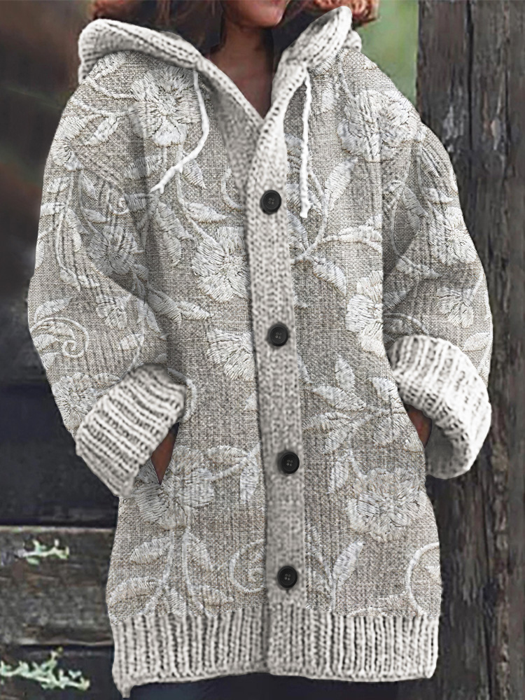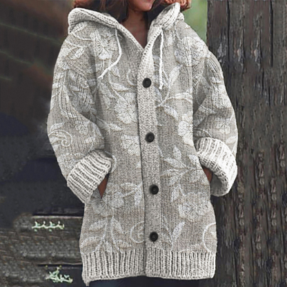 Floral Print Knitted Long Sleeve Hooded Cardigan