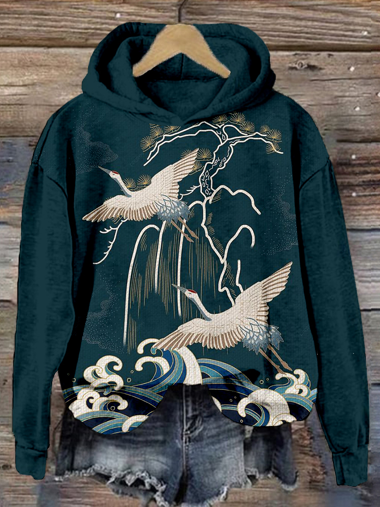 Flying Cranes & Pine Japanese Art Vintage Comfy Hoodie