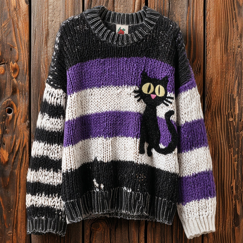 Halloween Black Cat Striped Cozy Knitted Sweater