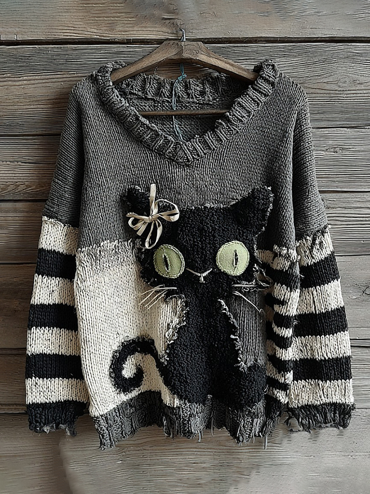 Halloween Black Cat Striped Patchwork Knitted V-neck Sweater