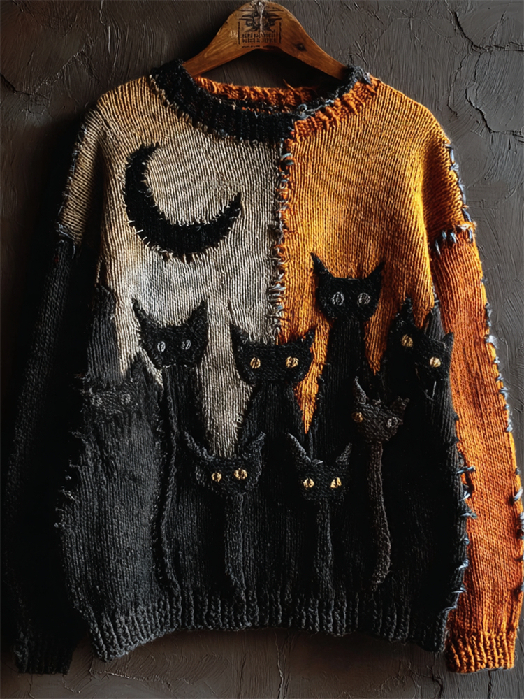 Halloween Night Black Cats Crochet Contrast Stitched Cozy Knit Sweater