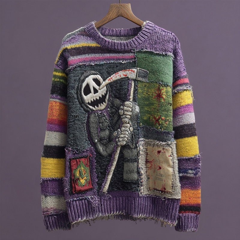 Halloween Spooky Ghoul Embroidered Patchwork Cozy Knitted Sweater