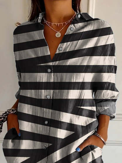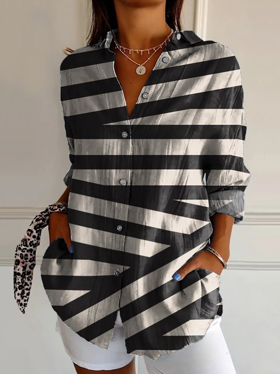 Irregular Strip Pattern Printed Women's Casual Cotton Shirt