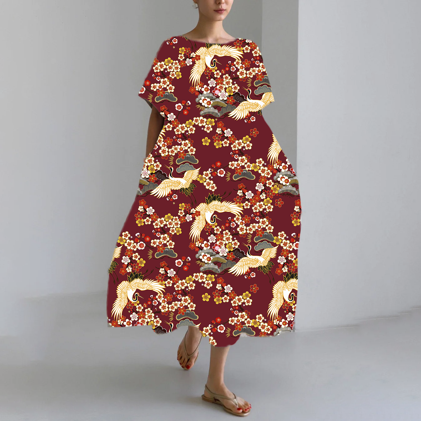 Japanese NEW Design Crane Cherry Blossom Art Linen Blend Maxi Dress