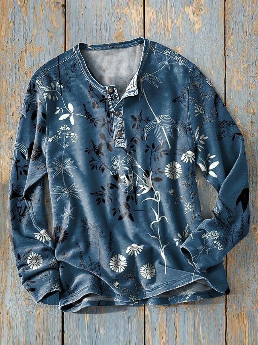 Men's Vintage Blue Floral Art Print Long Sleeve Henley Shirt