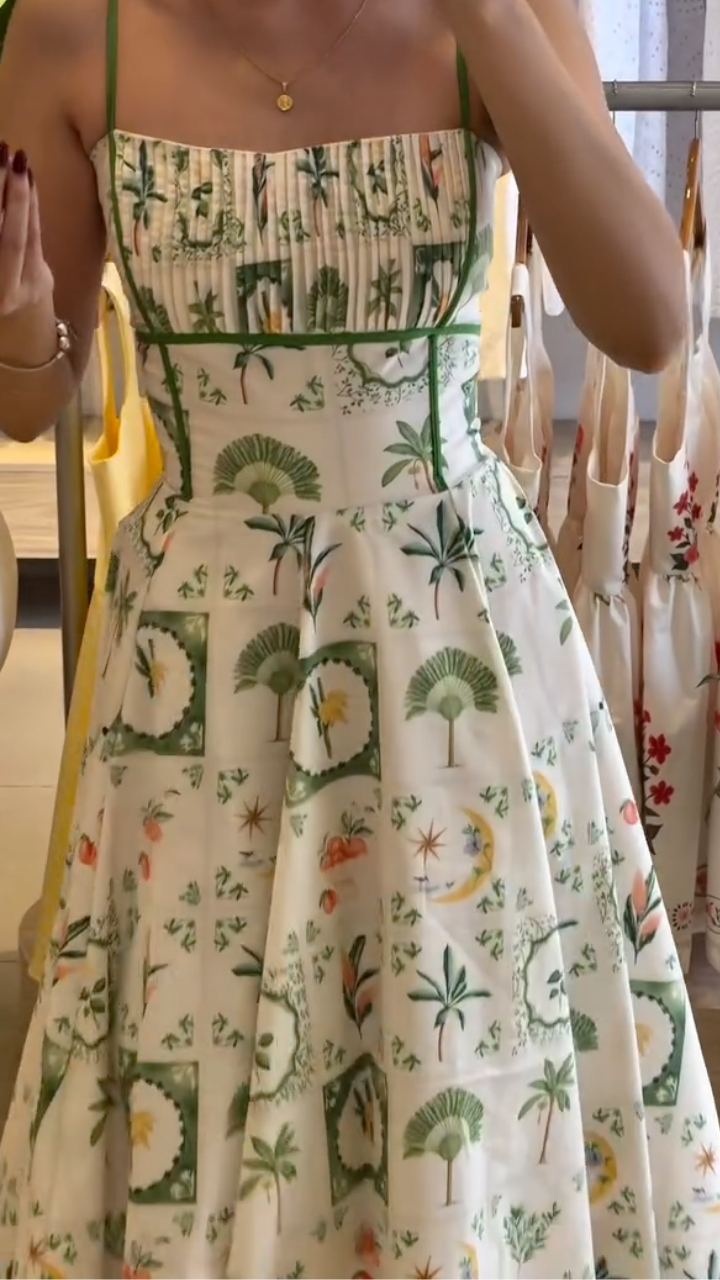 **Design:** Features a delicate spaghetti-strap design that beautifully highlights the lines of the shoulders and neck, creating a refreshing summer look. The pleated detailing at the bust adds dimension and offers a flattering, accommodating fit for various body types. Adorned with a full-coverage botanical print, the dress exudes a fresh, natural charm and instantly evokes a vacation vibe. The voluminous skirt silhouette creates an ethereal, graceful movement as you walk.