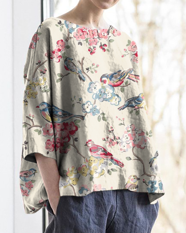 Vintage Floral and Bird Print Round Neck Cotton and Linen Loose Top