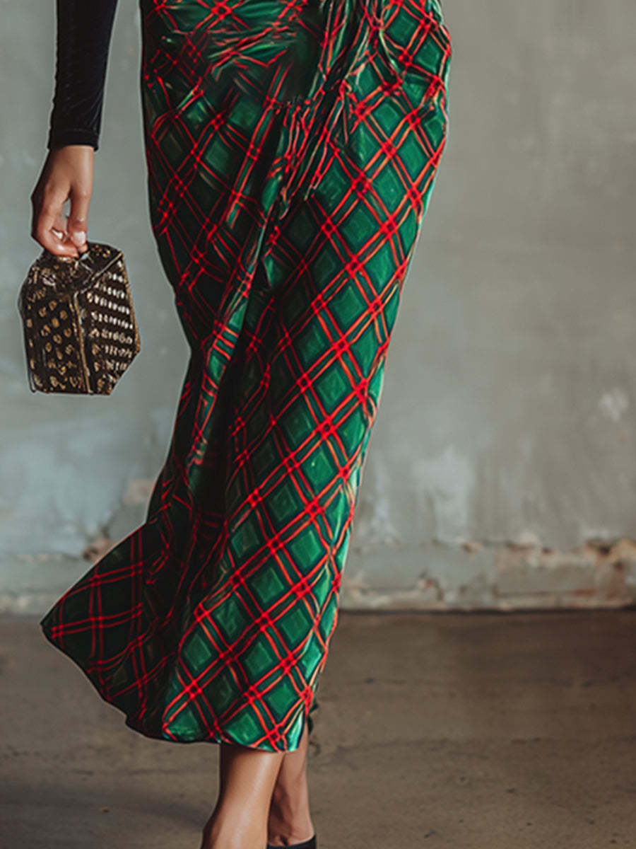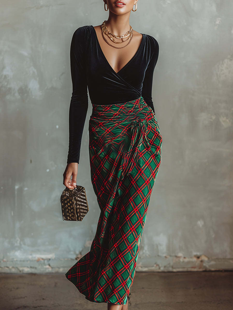 This retro-elegant plaid black velvet maxi dress perfectly blends vintage charm with modern sophistication. Crafted from luxurious black velvet and adorned with a classic plaid print, it's the perfect finishing touch to any sophisticated wardrobe.