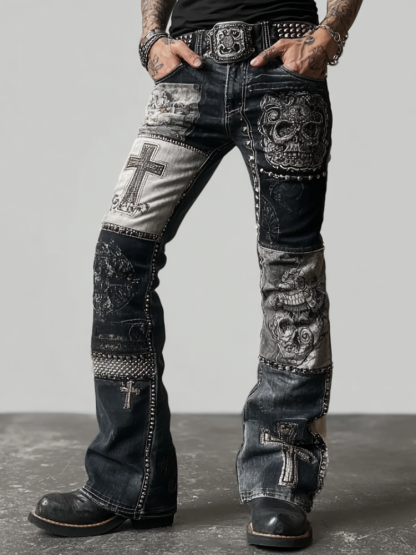 Rock Punk Skull Cross Element Retro Distressed Heavy Workwear Men's Denim Long Pants