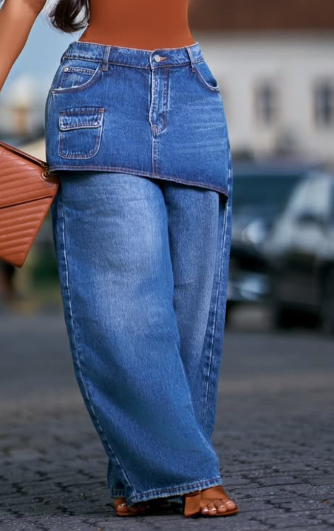**Design:** Features a faux-layered, "two-piece" stacked design—combining a skirt-style waistband with wide-leg trousers—to create a look rich in depth and visual interest. The high-waisted button fly is complemented by a multi-pocket layout, balancing aesthetic appeal with practical functionality. A vintage-style washed finish completes the look, delivering maximum retro vibes.
