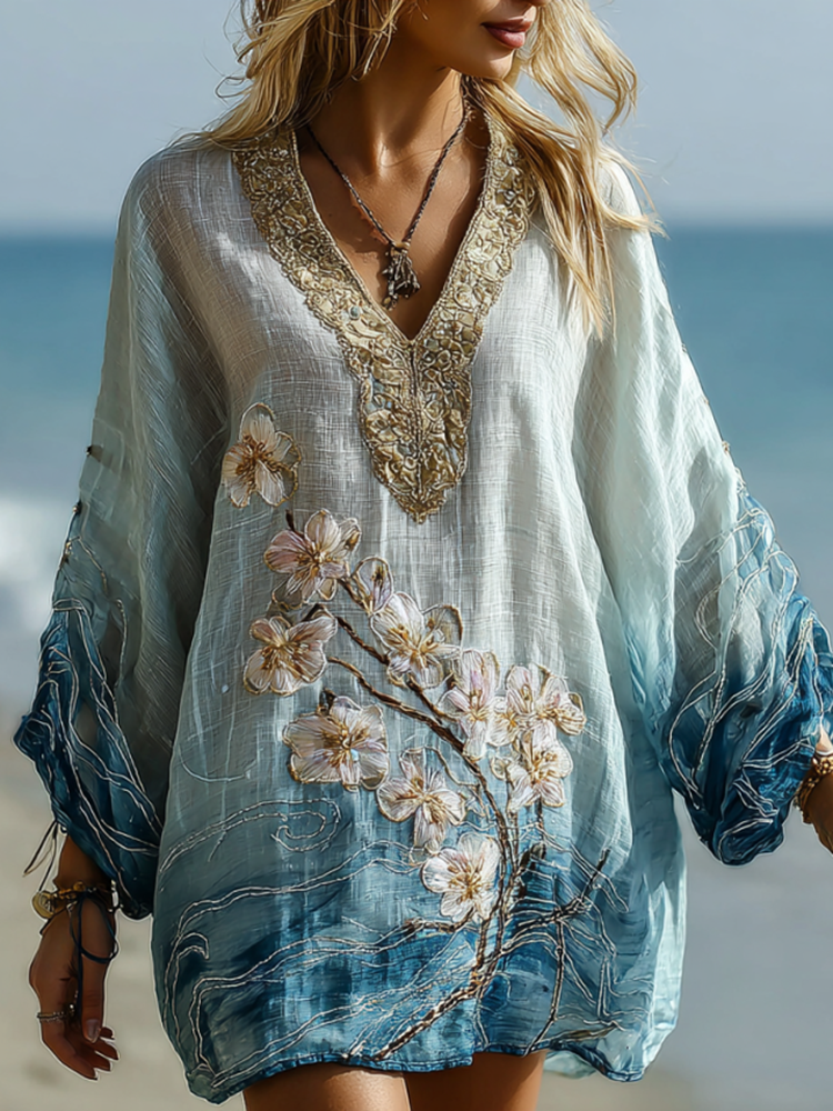 Vintage Gradient Marble Texture And Cherry Blossoms Pattern Linen Dress