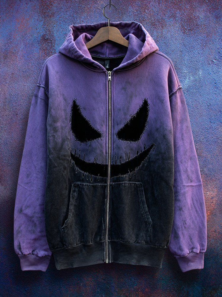 Vintage Halloween Spooky Face Gradient Zip Up Washed Hoodie