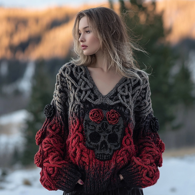 Vintage Red Roses Skull Viking Celtic V Neck Cozy Knit Sweater