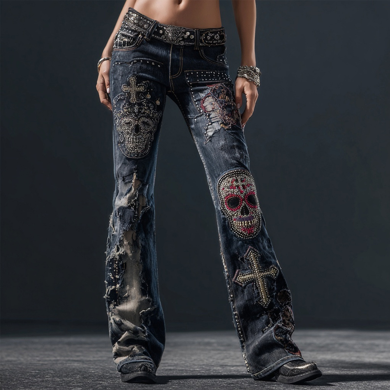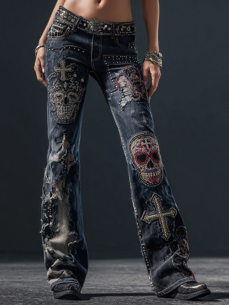 Vintage Rock Style Skulls & Cross Studded Distressed Bootcut Jeans