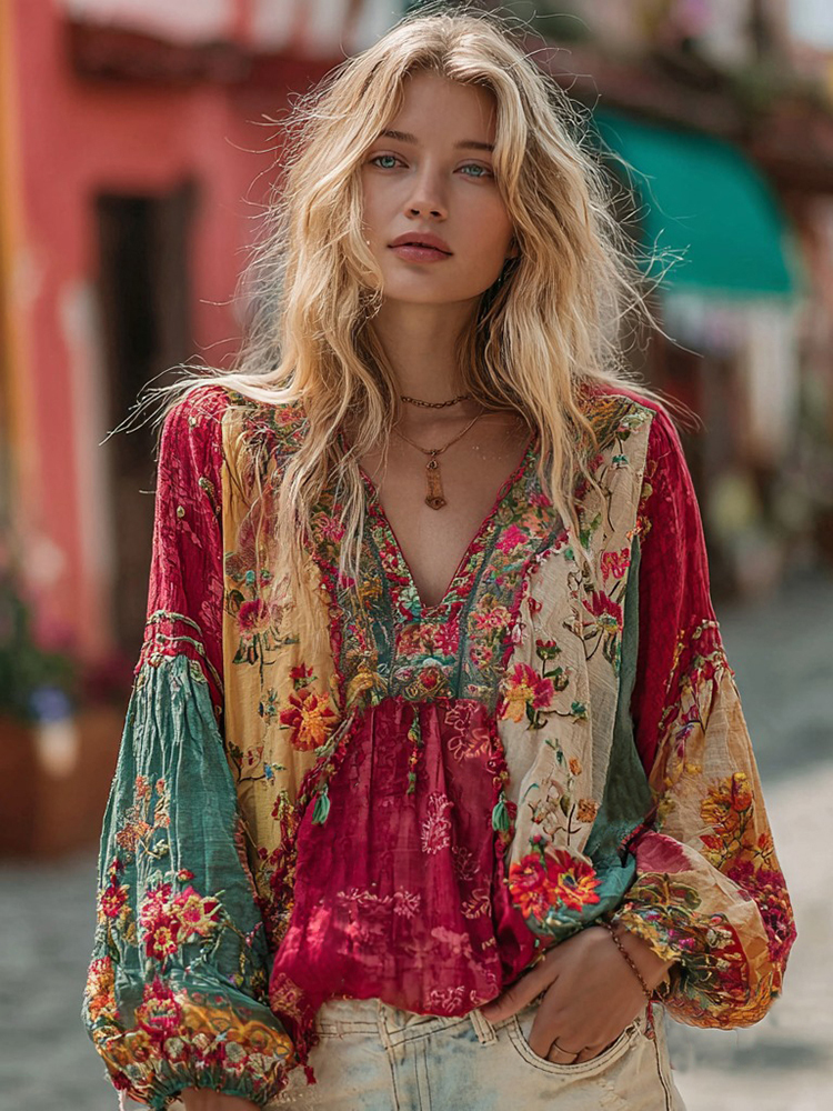 Women's Bohemian Ethnic Floral Colorblock Art Linen Blend V-neck Shirt