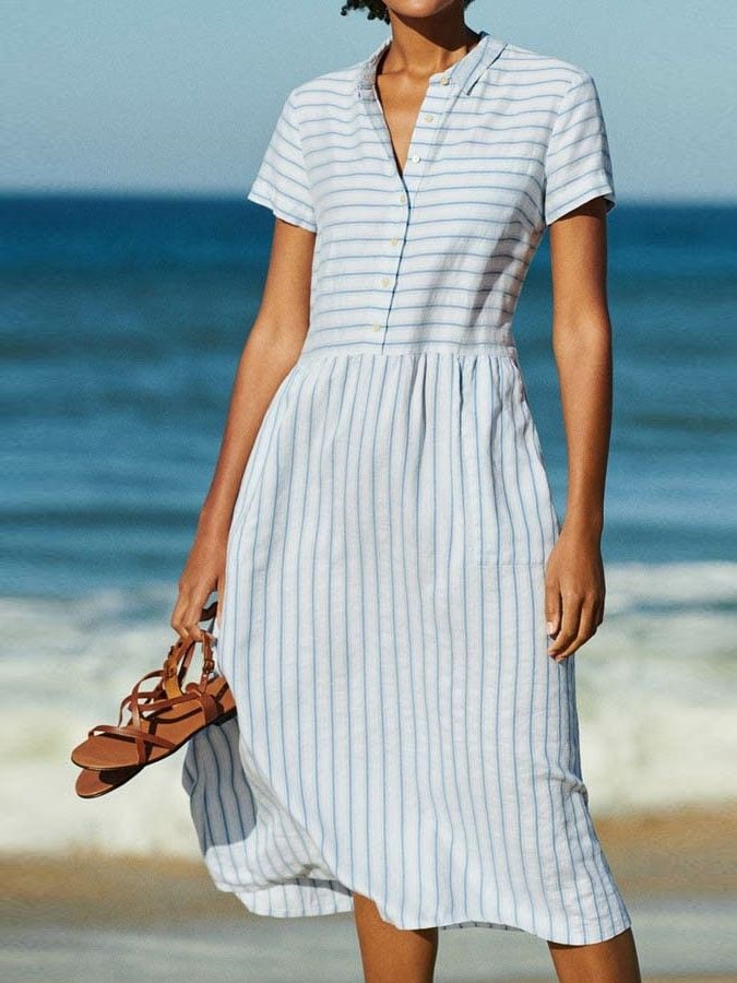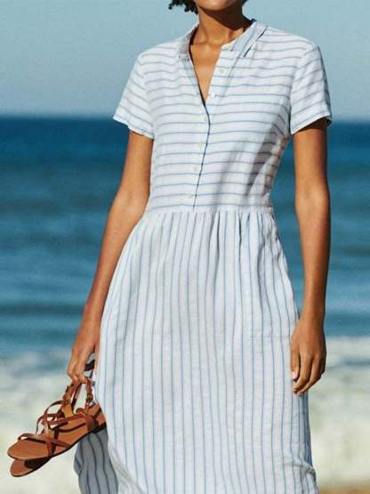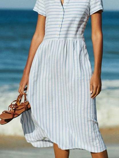 Women's Casual Solid Color Lapel Short Sleeve Striped Print Button Dress