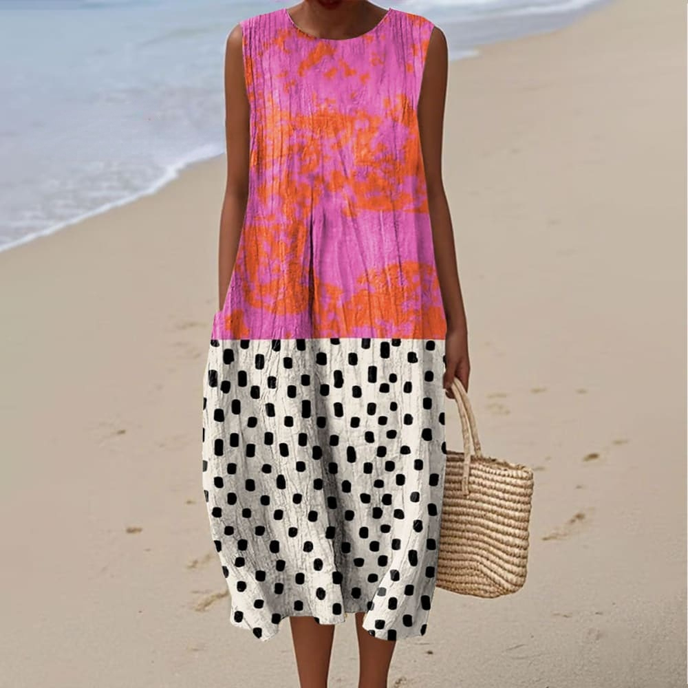 Women's Fashion Color Block Art Print Sleeveless Cotton Pocket Wrap Dress