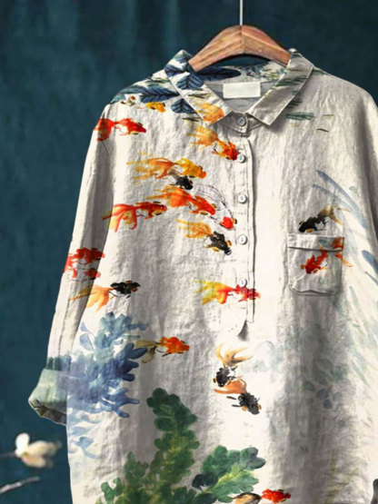 Women's Fish Art Print Casual Cotton And Linen Shirt