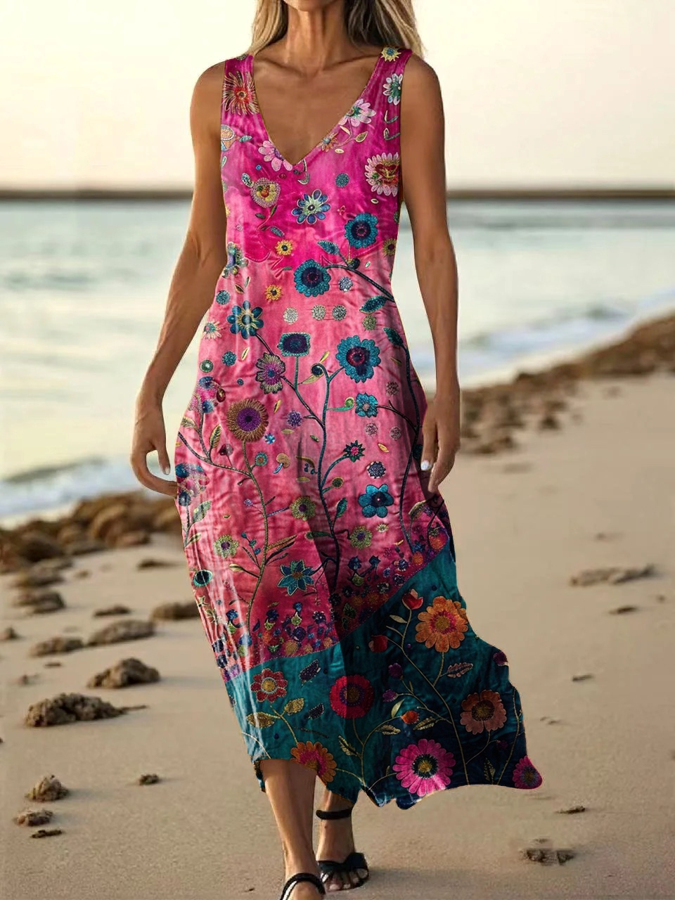 Women's Floral Art Print Pocket Cotton Dresses