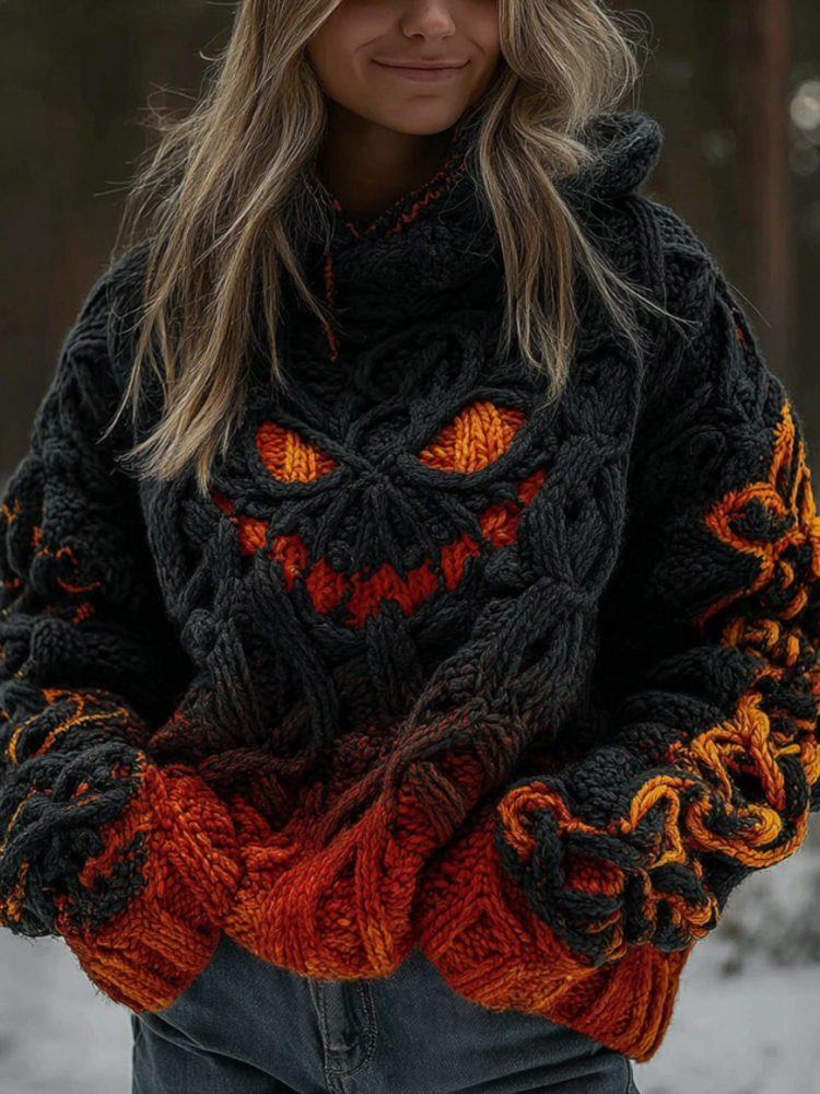 Women's Halloween Spooky Pumpkin Art Gradient Vintage Cozy Knit Hooded Sweater