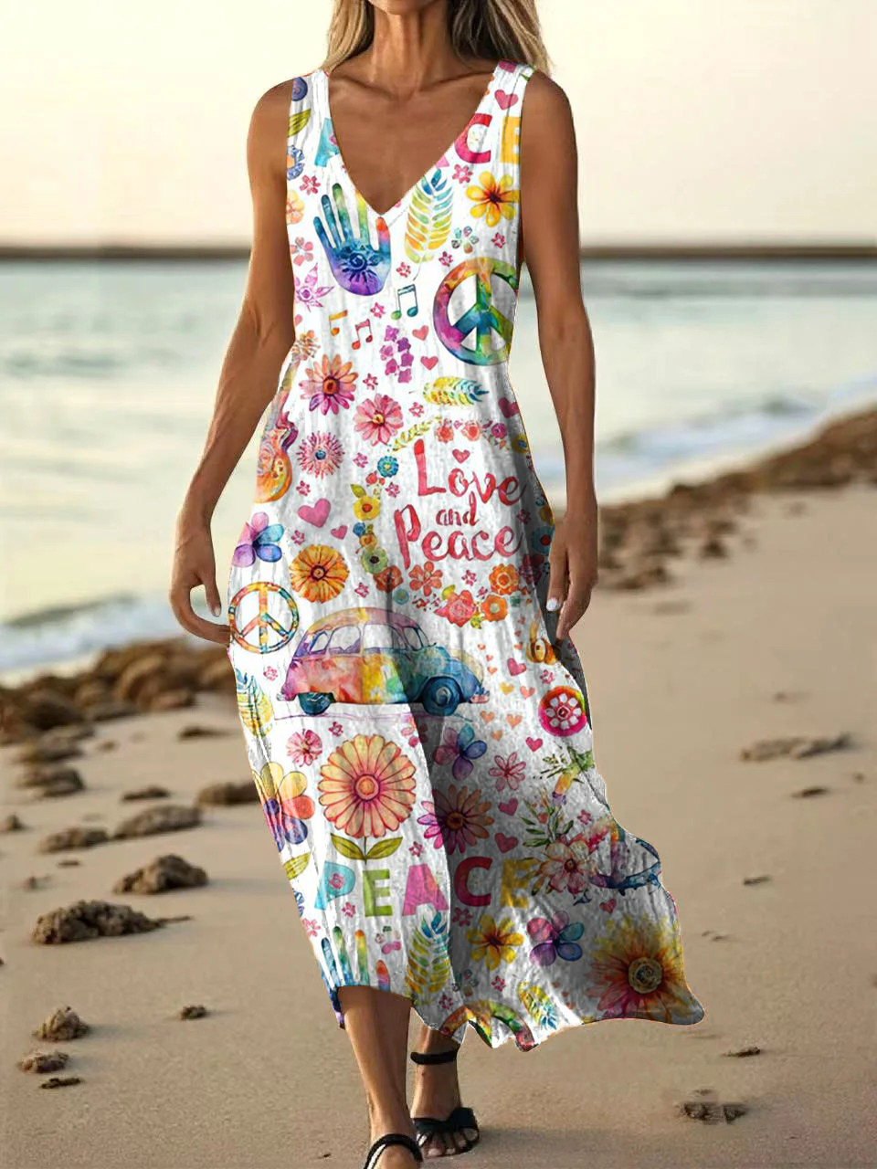 Women's Hippie Peace Love Art Print Pocket Cotton Dress