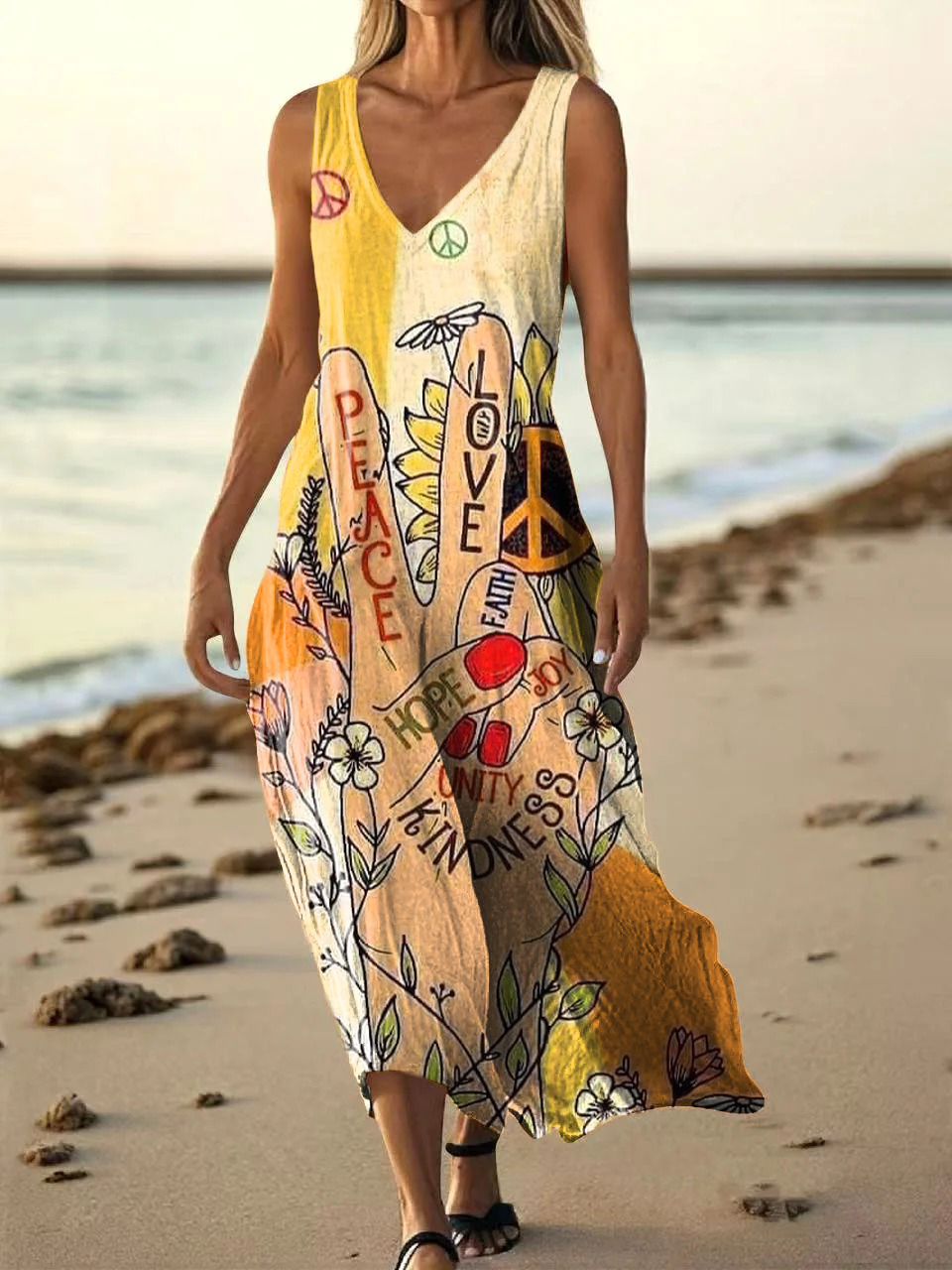 Women's Hippie Peace Love Art Print Pocket Cotton Dress