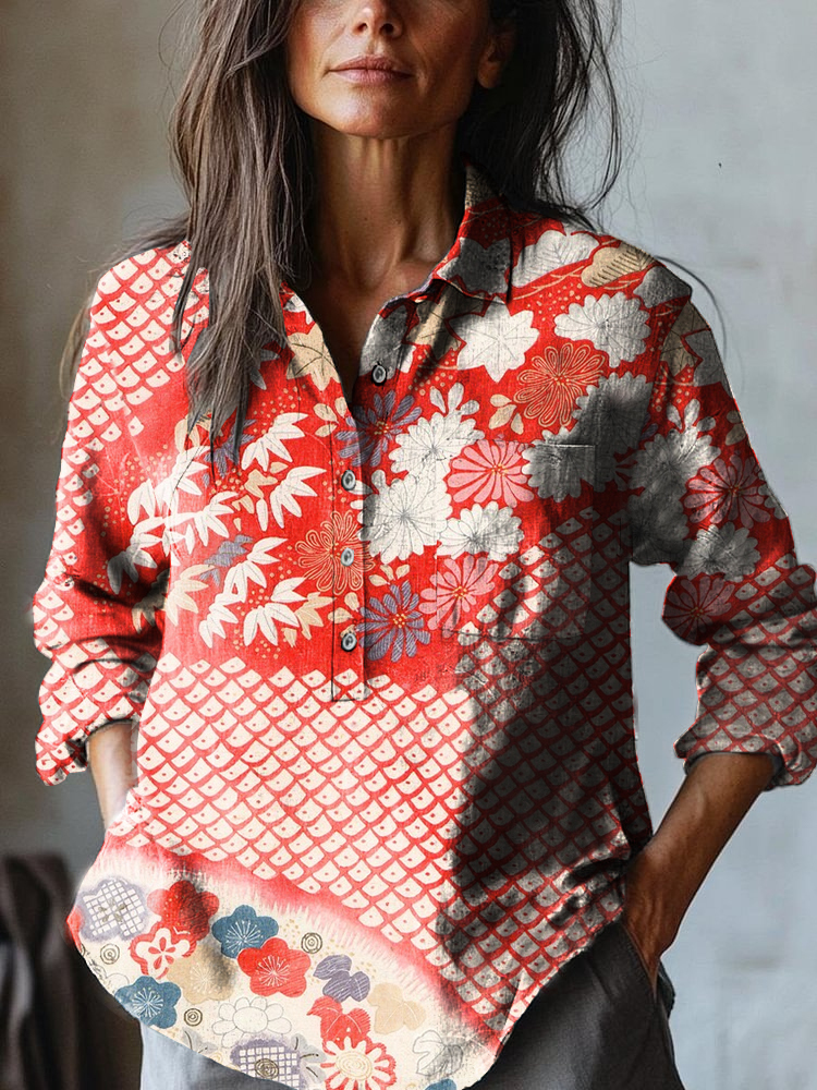 Women's Japanese Plant Art Print Casual Cotton And Linen Shirt