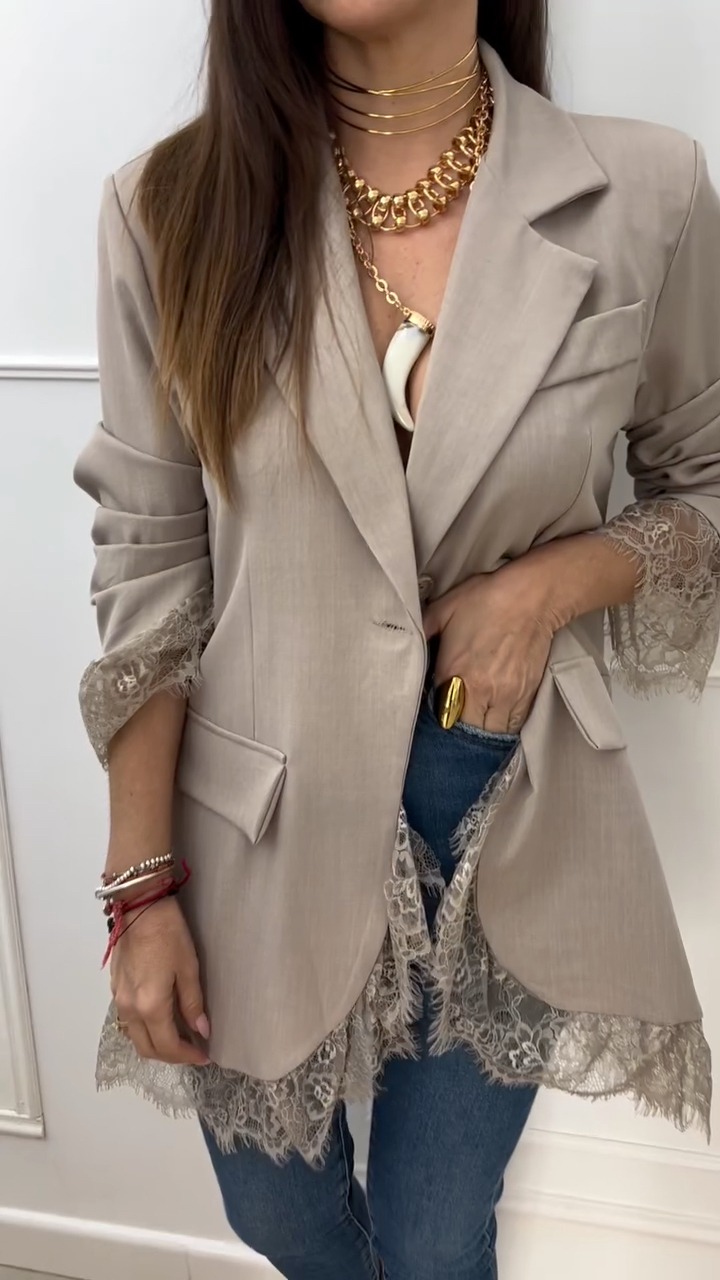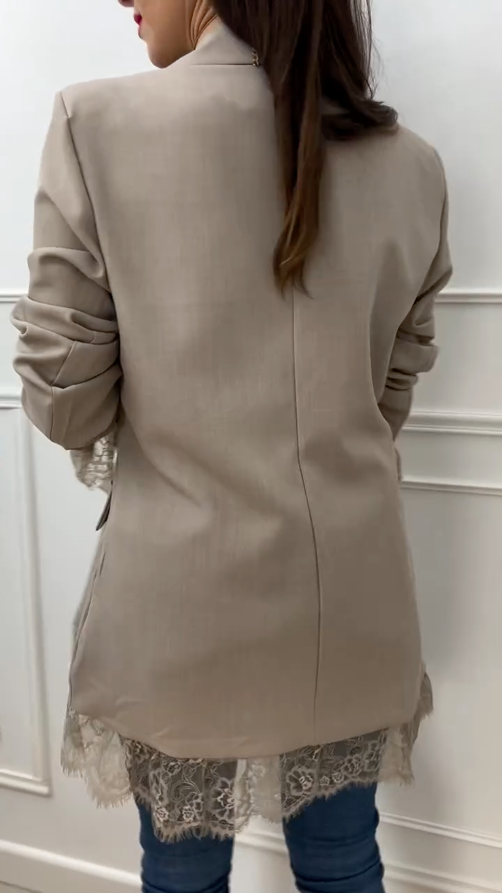 Design: A classic, versatile single-breasted blazer silhouette; lace trim accents at the cuffs and hem add a touch of feminine elegance; the sleeves are designed to be scrunched up, allowing for a variety of styling options.