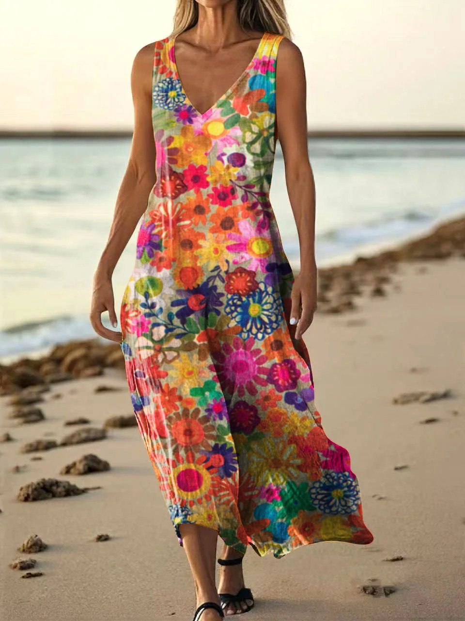 Women's Painting Floral Art Print Pocket Cotton Dress