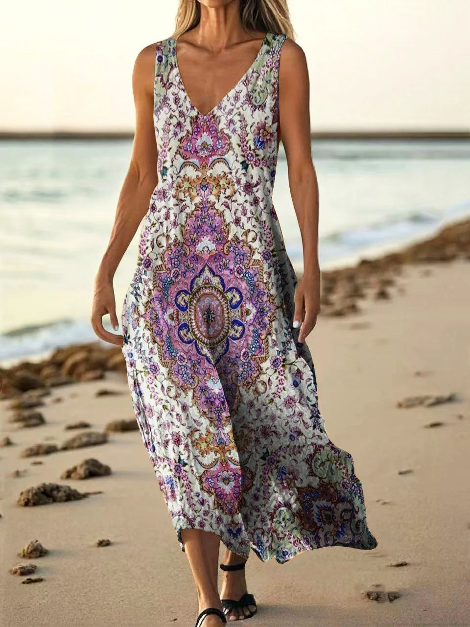 Women's Retro Ethnic Totem Art Pattern Print V-neck Sleeveless Cotton Pocket Dress