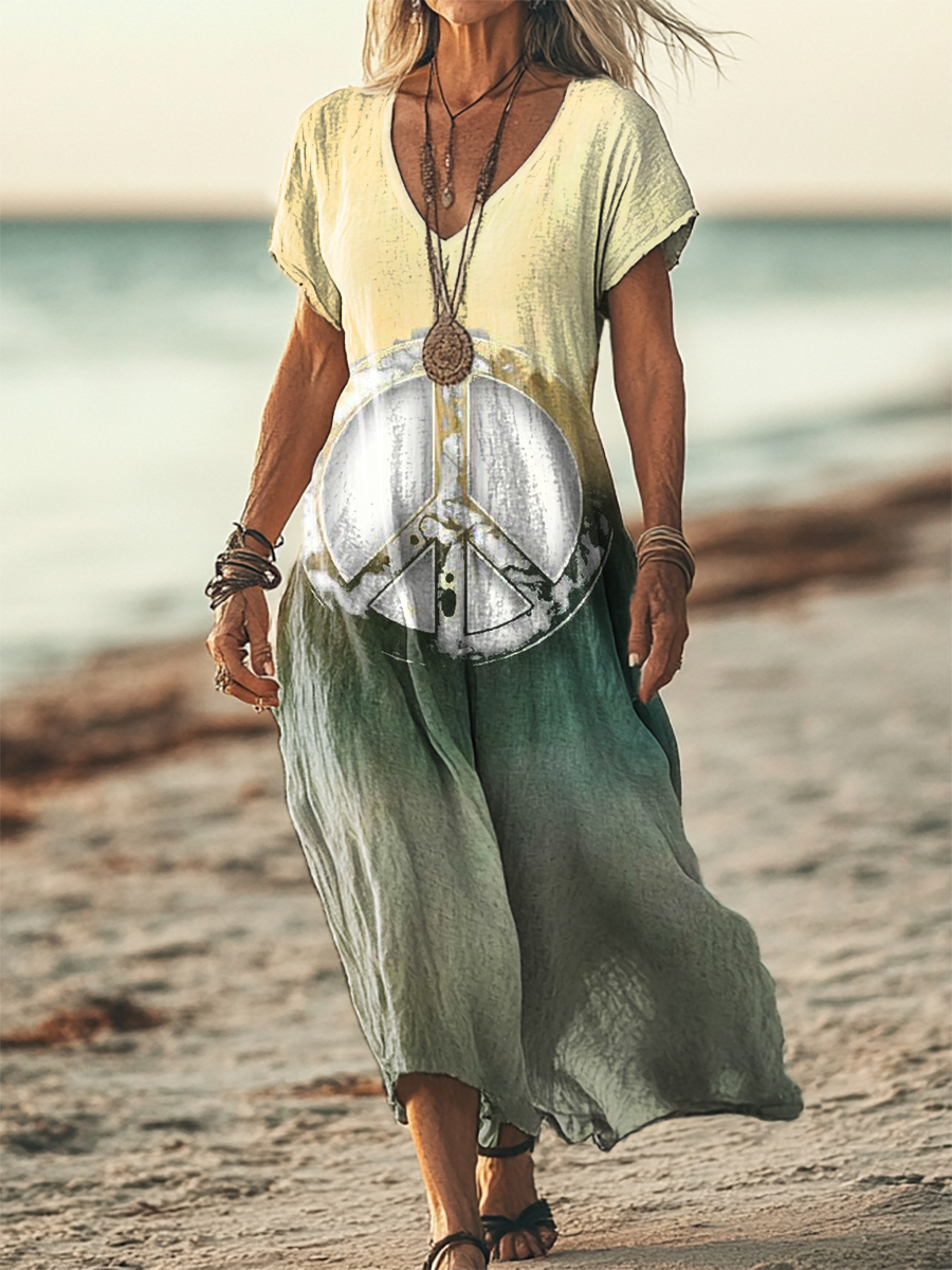 Women's Retro Hippie Peace Sign Print Pocket Cotton Dress